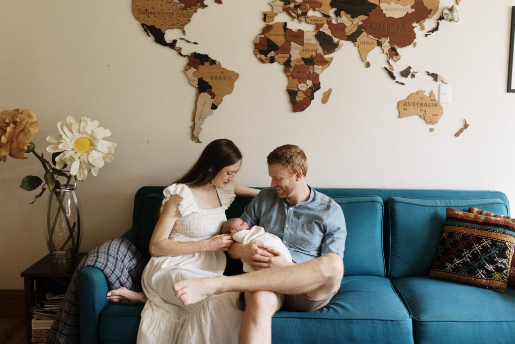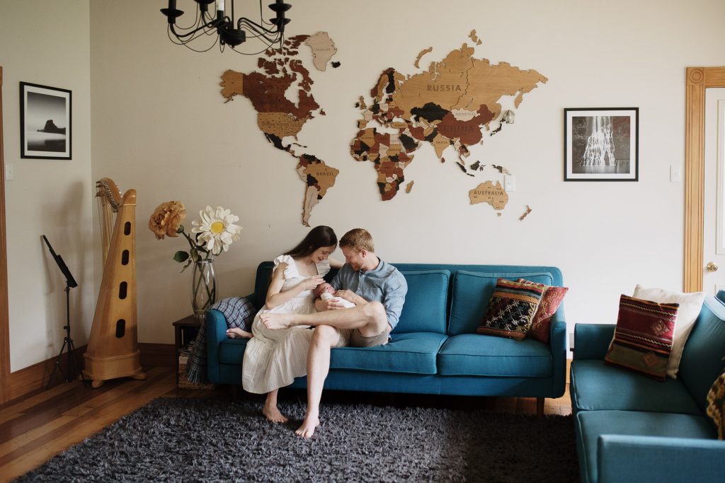 I’ve photographed Brydie and Ben a few times before and I knew wee Florence would be just as photogenic as her Mummy and Daddy. Brydie is a fashion designer and I loved seeing all the little outfits she was creating for Florence using fabric from her collections. Their home is a 1918 bungalow with some beautiful features typical of homes during that time. I loved the large bungalow windows, and can we just appreciate this world map designed, created, cut and carefully hung by Brydie herself! I’m also crushing on those oversized daisies and that HARP in the corner! Thanks for having me capture these precious moments for you team x