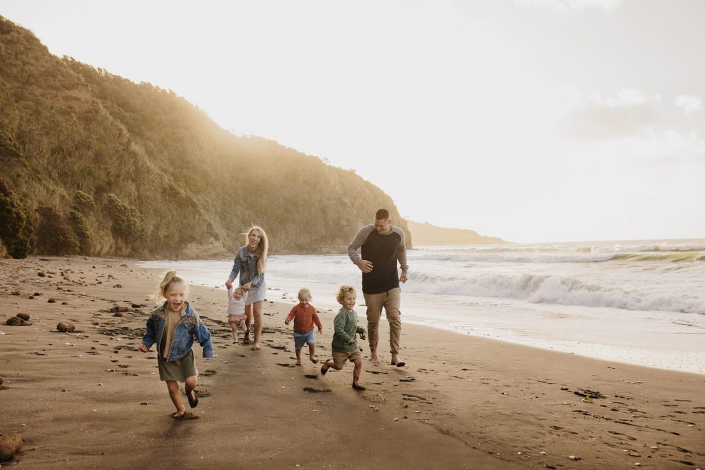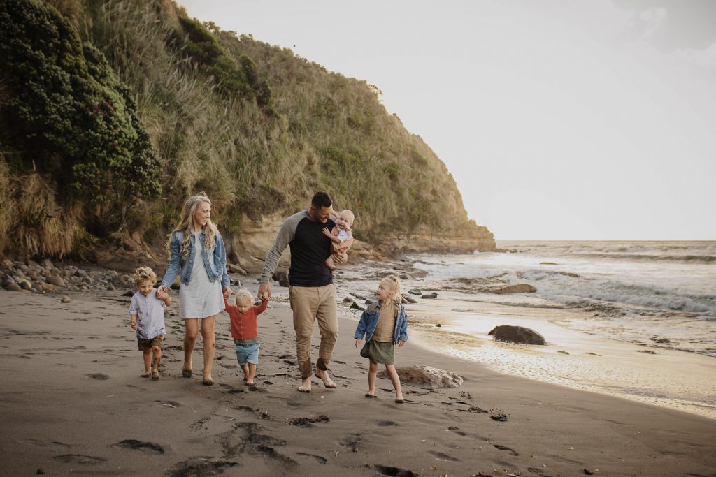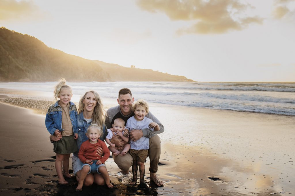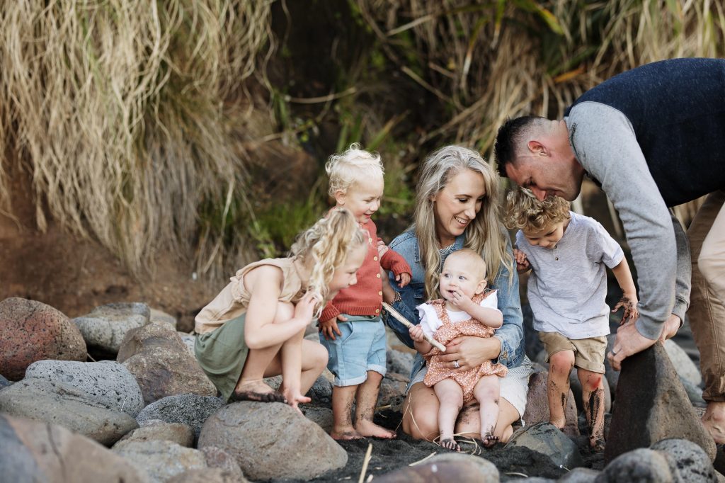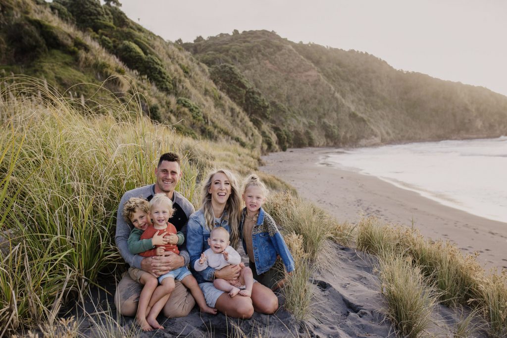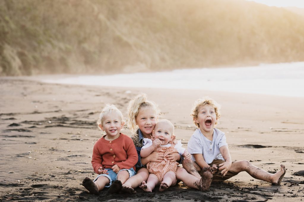 The Turners Raglan family photo session was one of those shoots that started out a little crazy, and in all honesty, half way through I wasn’t sure if I had more than a handful of good photos for them. I remember Nicole looking at hubby and saying’ this is a bit of a disaster!’. But so often shoots feel chaotic, and crazy, and with four young kids this is exactly what I had expected from the Turners shoot. This is why my session times aren’t limited to a certain number of minutes, it’s so helpful to have some buffer time for breaks, snacks, and to tip the toes in that delicious Raglan sea. After letting the kids have a run around on the beach and do some rock hopping, they were much more cooperative. It always works out….and if it doesn’t, I’ll get you back for another try (after doing hundreds of family shoots I have only ever had to do this twice)! We finished the session with some gorgeous smiling playing images, and to top it off we got the best of those Raglan sunsets for romantic couples shot!